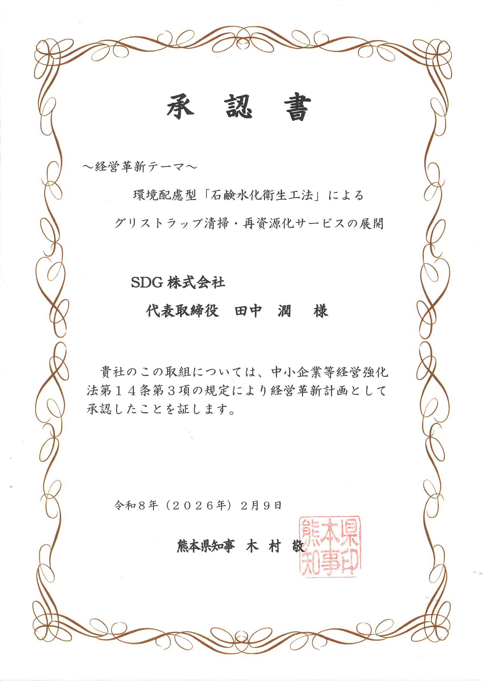 熊本県より環境配慮型『石鹸化衛生工法』によるグリストラップ清掃・再資源化サービスによる展開の経営革新計画の承認を受けました。