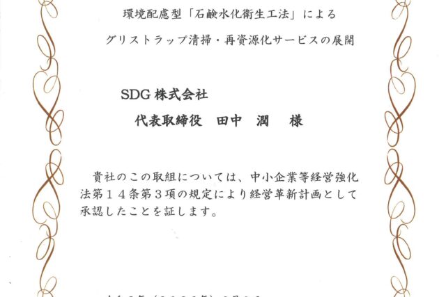 熊本県より環境配慮型『石鹸化衛生工法』によるグリストラップ清掃・再資源化サービスによる展開の経営革新計画の承認を受けました。